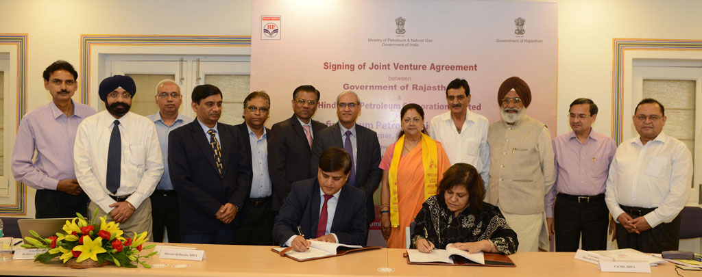 Chief Minister Smt. Vasundhara Raje witnessed the signing ceremony at CM residence when Principal Secretary Mines & Petroleum Smt. Aparna Arora and Director (Finance) of HPCL Shri J. Ramaswami signed the JV agreement respectively on behalf of the state government and the HPCL. The CM expressed satisfaction on the progress of the refinery. She directed the officials to proceed further on the project on equally fast pace as soon as the Environmental Clearance was received from the Union Ministry of Environment.