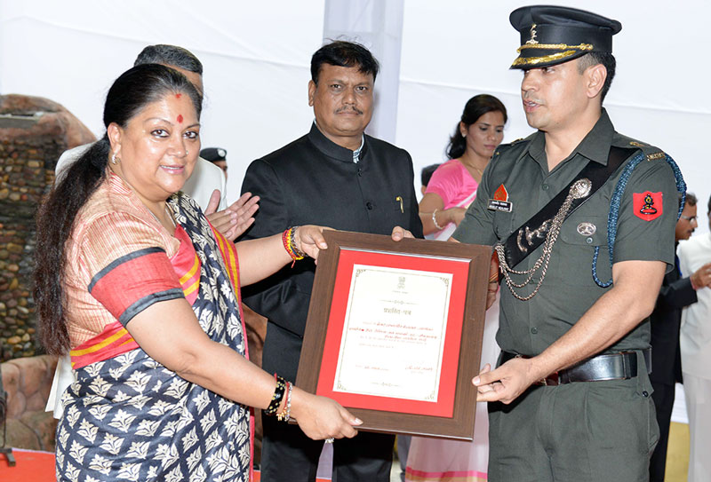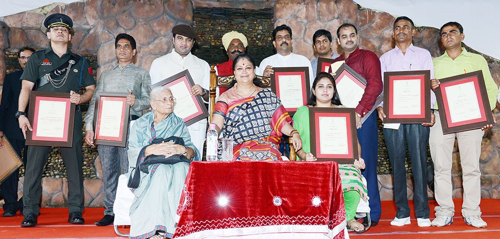 श्रीमती राजे ने पत्राकारिता एवं समाज सेवा के क्षेत्रा में श्री प्रकाश चंद शर्मा, एक्यूप्रेशर सेवा समिति जयपुर के आयुर्वेदाचार्य डाॅ. पीयूष त्रिवेदी, साहसिक कार्य के लिए कमाण्डिंग आफिसर, डेयर डेविल्स मेजर अभय जीत मेहलावत, आदिवासी लोकनृत्य नाट्यशैली के लिए उदयपुर के डाॅ. लईक हुसैन, संगीत गायन के क्षेत्रा में कोटा की सुश्री भव्या छाबड़ा, सितार वादन के क्षेत्रा में कोटा के ही श्री विकास भारद्वाज, माँगणियार गायन के लिए जयपुर के श्री समन्दर माँगणियार, संग्रहालय जयपुर की डाॅ. श्रीमती चन्द्रमणि सिंह, समाज सेवा के क्षेत्रा में संभली ट्रस्ट जोधपुर के श्री गोविन्द सिंह राठौड़, समाज सेवा के क्षेत्रा में ही जयपुर की श्रीमती भावना जगवानी, आई.टी. एवं साइबर फोरेंसिक क्षेत्रा में झुन्झुनू के श्री राजशेखर राजहरिया तथा साहसिक कार्य के लिए धौलपुर के श्री नरेन्द्र सिंह को सम्मानित किया।