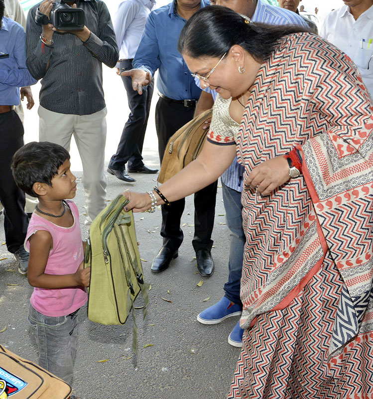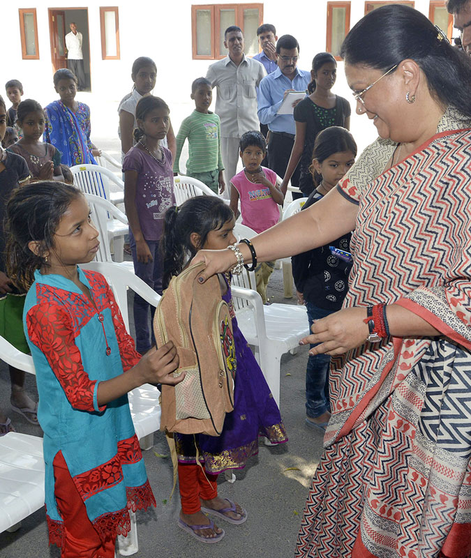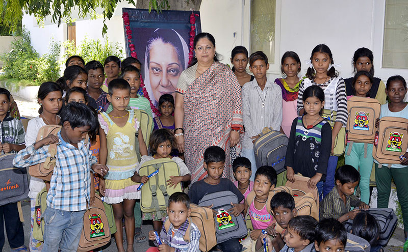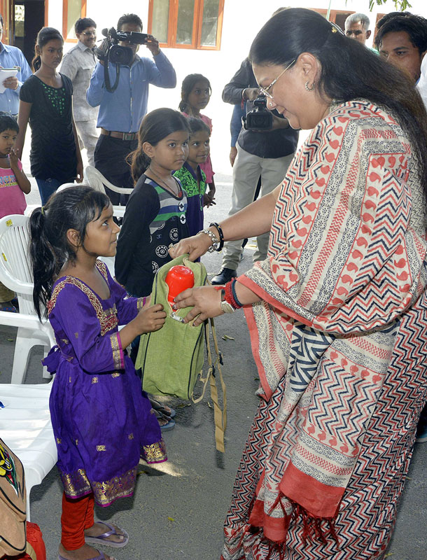 मुख्यमंत्री श्रीमती वसुन्धरा राजे ने सोमवार को राजमाता विजया राजे सिंधिया की जयंती के मौके पर मुख्यमंत्री निवास पर कच्ची बस्ती में रहने वाले बच्चों को स्कूल बैग, काॅपी, किताब, पानी की बोतल एवं चाॅकलेट वितरित की। श्रीमती राजे ने आत्मीयता के साथ इन जरूरतमंद बच्चों से बातचीत करते हुए उनका नाम, कक्षा एवं पढ़ाई-लिखाई के बारे में बातचीत की। भाजपा जयपुर जिला देहात की ओर से आयोजित इस आयोजन में जयपुर भाजपा देहात के जिलाध्यक्ष श्री डीडी कुमावत एवं महामंत्री श्री अमित शर्मा मौजूद थे।