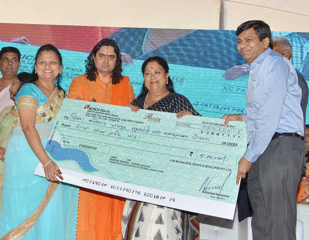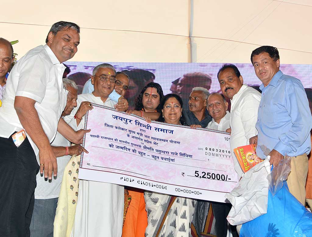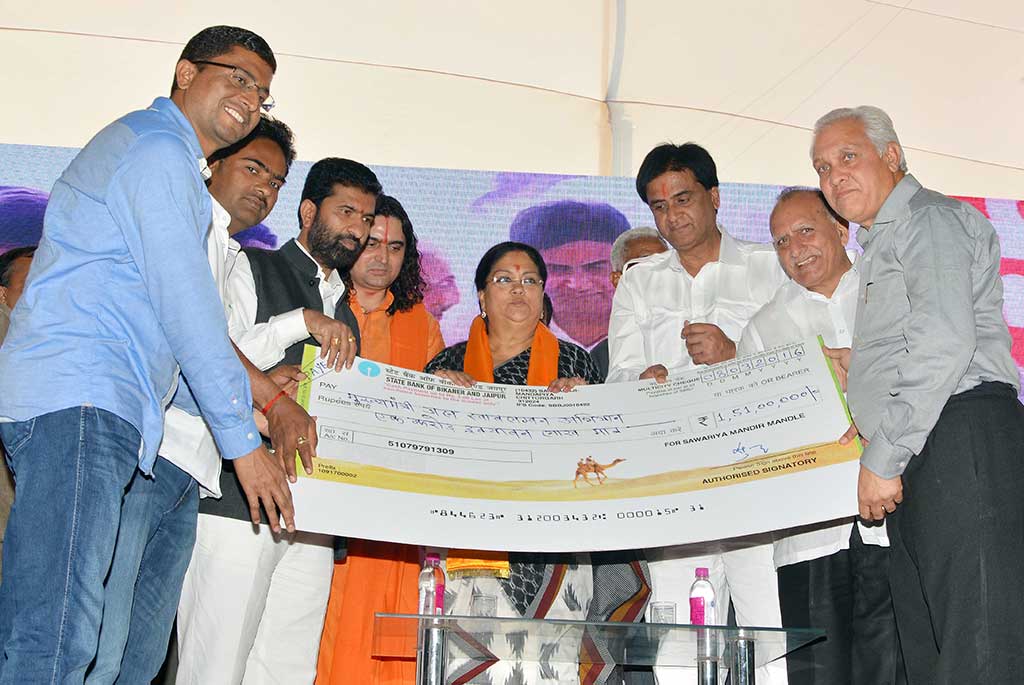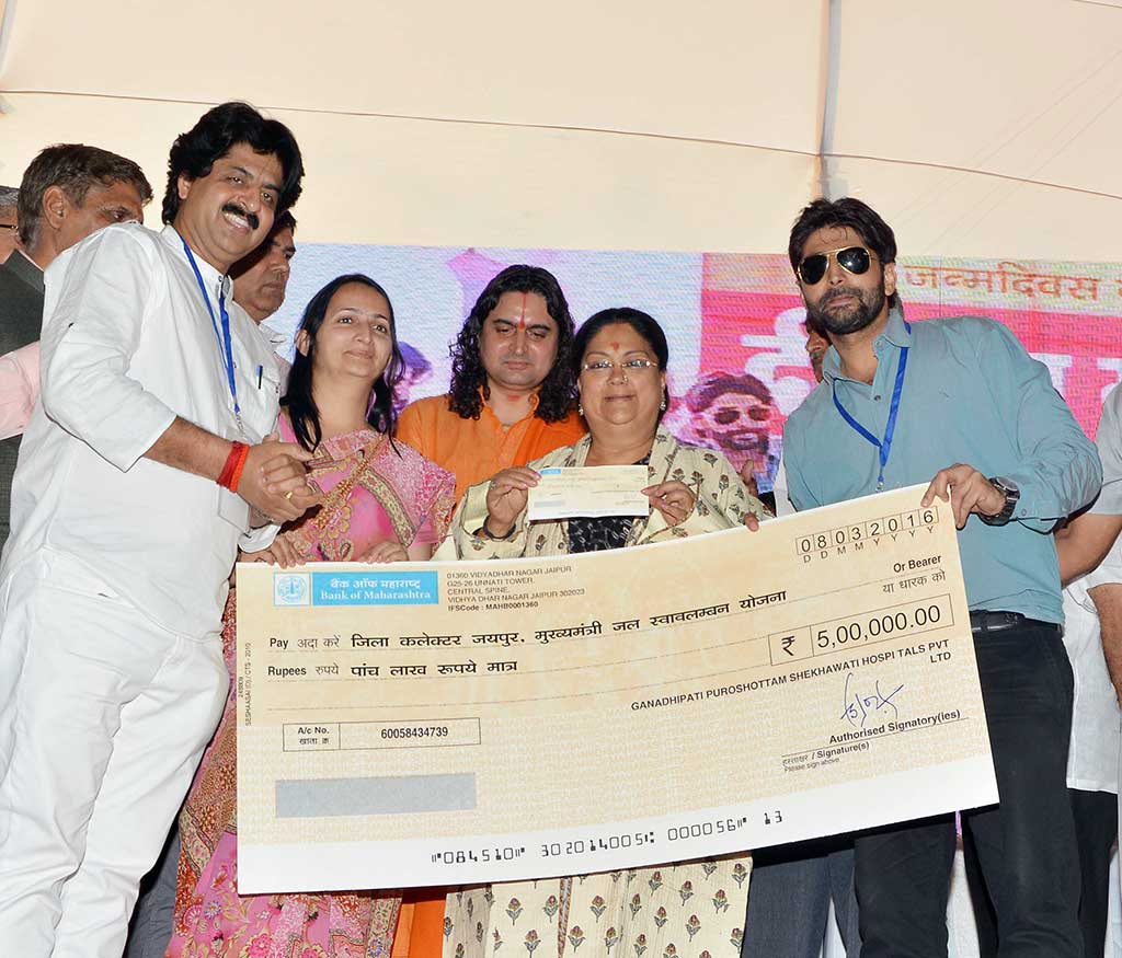 श्रीमती राजे ने कार्यक्रम के दौरान जल स्वावलम्बन अभियान में आर्थिक सहयोग देने वाले सभी समाजों और दानदाताओं का आभार व्यक्त किया। कार्यक्रम में विभिन्न समाजों की ओर से करीब 5 करोड़ रुपये की राशि जल स्वावलम्बन अभियान के लिए दी गई। इसमें चिŸाौड़गढ़ के सांवलिया सेठ ट्रस्ट की ओर से 1 करोड़ 51 लाख रुपये की राशि अभियान के लिए दी गई। उन्होंने आह्वान किया कि स्वच्छता एवं जल स्वावलम्बन के अभियानों में सभी लोग अपना पूरा योगदान दें। इन अभियानों से प्रदेश की तस्वीर जरूर बदलेगी।