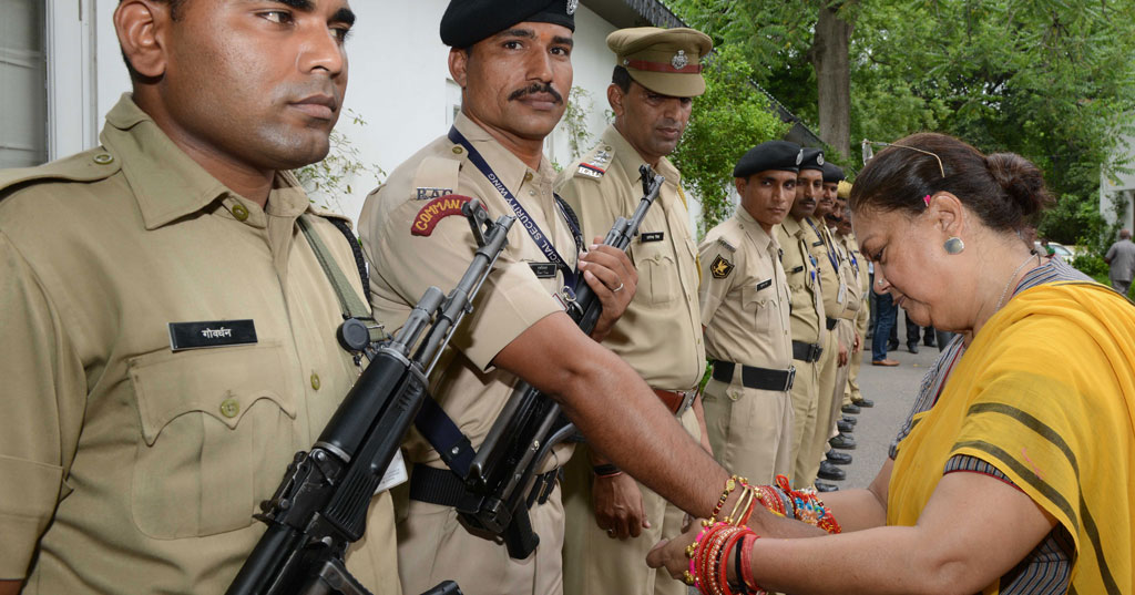 मुख्यमंत्री श्रीमती वसुन्धरा राजे ने रक्षाबंधन के मौके पर उनकी सुरक्षा में तैनात आरएसी कमाण्डोज को राखी बांधी। मुख्यमंत्री ने जब उनकी कलाई पर राखी बांधी तो सभी कमांडो भावुक हो गये।