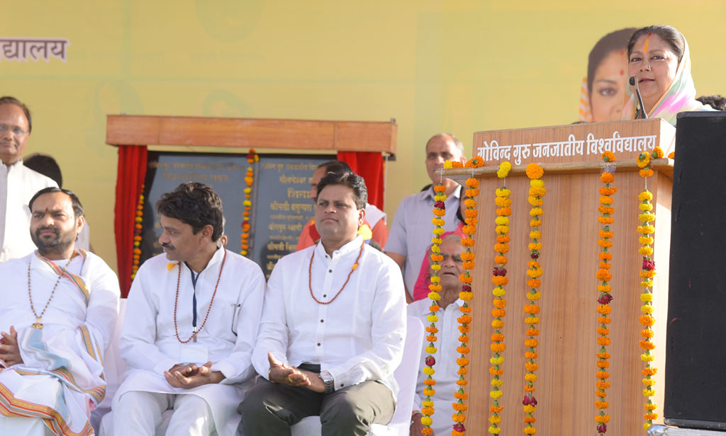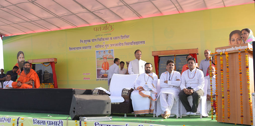 श्रीमती राजे गुरुवार को बासंवाड़ा में गोविंद गुरु जनजातीय विश्वविद्यालय के भवन के शिलान्यास के अवसर पर आयोजित कार्यक्रम में बोल रही थीं। इस दौरान उन्होंने पतंजलि योग पीठ द्वारा आयोजित निःशुल्क योग चिकित्सा एवं ध्यान शिविर में हिस्सा लिया।