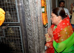 मुख्यमंत्री श्रीमती वसुन्धरा राजे ने शनिवार को करौली के कैला देवी मंदिर पहुंचकर पूजा अर्चना की। उन्होंने मंदिर में कैला देवी के दर्शन कर प्रदेश की उन्नति एवं खुशहाली की कामना की। इस दौरान महिला एवं बाल विकास राज्यमंत्री श्रीमती अनिता भदेल भी मुख्यमंत्री के साथ थीं।